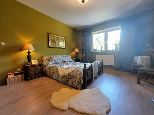 Wybudowany kilkanaście lat temu z ogromną dbałością, pierwotnie pięciopokojowy - aktualnie to salon z otwartą kuchnią i jadalnią, gabinet, sypialnia gościnna, główna sypialnia z garderobą i łazienką, druga łazienka, kotłownia (łącznie 206m2) i garaż dwustanowiskowy (ok. 50m2).