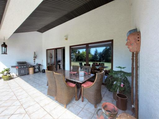 Z salonu od strony południowej wyjście na zadaszony taras (ok. 40m2) i pięknie zagospodarowany ogród.