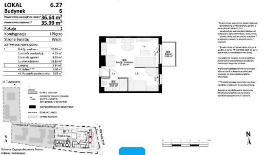 Jednopokojowy lokal 35,99 m2. Apartament na 1 piętrze posiada Pokój z aneksem - 32,05 m2: strefa przedpokoju - 4,19 m2, strefa sypialni - 9,03 m2, strefa dzienna - 18,83 m2, łazienką - 3,94 m2, balkon - 3,90 m2. Zapewnia idealne miejsce do relaksu.