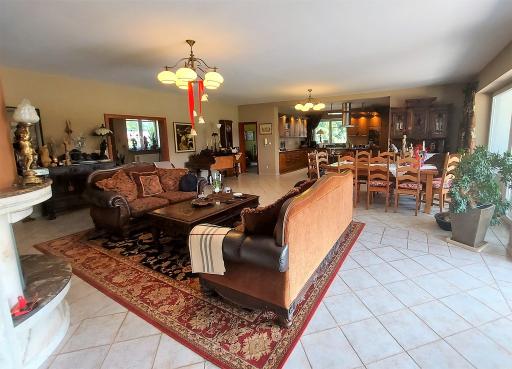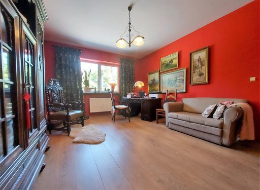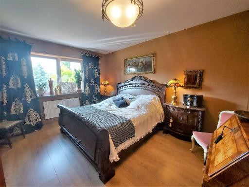 Wybudowany kilkanaście lat temu z ogromną dbałością, pierwotnie pięciopokojowy - aktualnie to salon z otwartą kuchnią i jadalnią, gabinet, sypialnia gościnna, główna sypialnia z garderobą i łazienką, druga łazienka, kotłownia (łącznie 206m2) i garaż dwustanowiskowy (ok. 50m2).