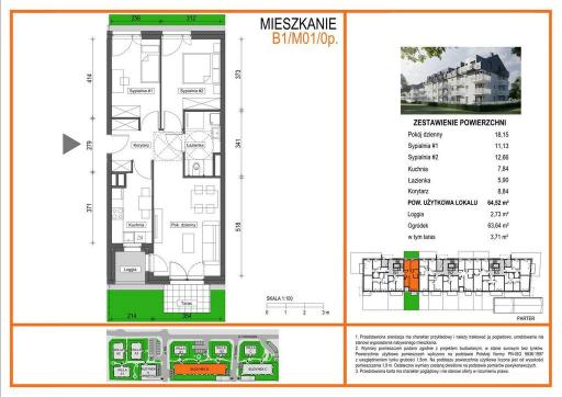 Mieszkanie 3 pokojowe o powierzchni 64,52 m2 , usytułowane na parterze budynku. Składa się z: Salonu-18,15 m2, Kuchni-7,84 m2, Sypialni- 11,13 m2,Sypialni -12,66 m2, Łazienki -5,90 m2, Korytarza -8,84 m2; Loggia-2,73 m2, Ogródek-63,64 m2 w tym taras - 3,71 m2.