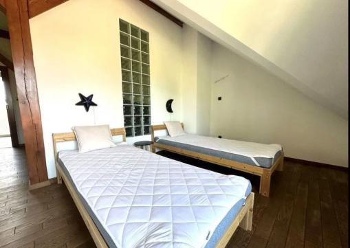 Pierwszy i drugi segment (180m2) jest w pełni wykończony i użytkowany. Trzeci dom segmentowy (90m2) nie jest wykończony i pozwala na wszechstronne zagospodarowanie. W sumie do dyspozycji jest 9 pokoi oraz 6 łazienek.