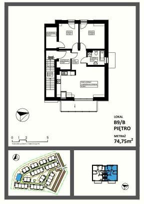 Mieszkanie 3 pokojowe o powierzchni 75,82 m2 , usytułowane na 1 piętrze budynku. Składa się z: Salonu z aneksem kuchennym -26,22 m2 , Sypialni- 12,09 m2, Pokój 9,75m2, Łazienki -4,74 m2, hol -4,49m2, schody-8,29 m2, wiatrołap-4,63 m2, garderoba -4,5 m2; balkon-7,5 m2.