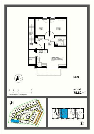 Mieszkanie 3 pokojowe o powierzchni 75,82 m2 , usytułowane na 1 piętrze budynku. Składa się z: Salonu z aneksem kuchennym -25,68 m2 m2, Sypialni- 12,47 m2, Pokój 10,75m2, Łazienki -4,99 m2, hol -4,49m2, schody-8,22 m2, wiatrołap-4,77 m2, spiżarnia -4,44 m2; balkon-7,5 m2.