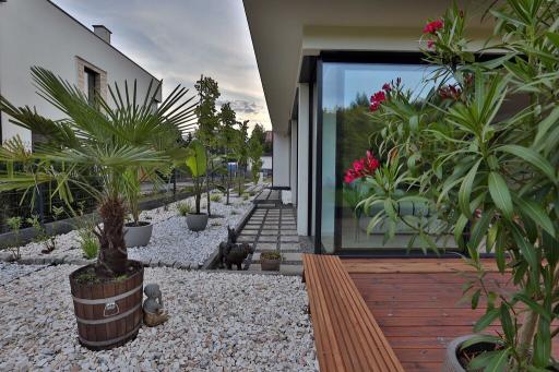 4. Ogród w pełni zagospodarowany – drzewa, kwiaty, roślinność śródziemnomorska (palmy, oleander, bananowce, strelizia),