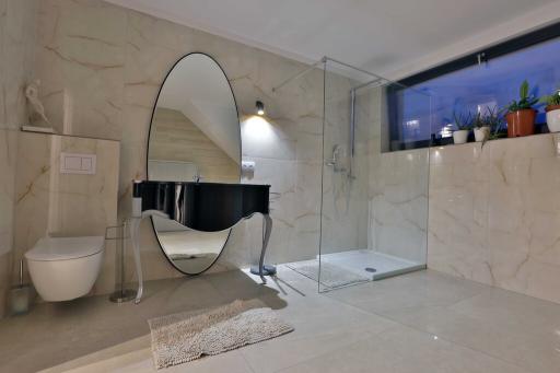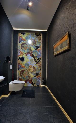 9. Kafle: Versace (salon, kuchnia, czarna łazienka przy salonie, wielkoformatowy decor w łazience przy salonie – na indywidulane zamówienie z Włoch), Imola (wielkoformatowe, łazienka przy sypialni) i Marazzi (łazienka przy siłowni),