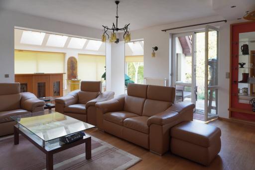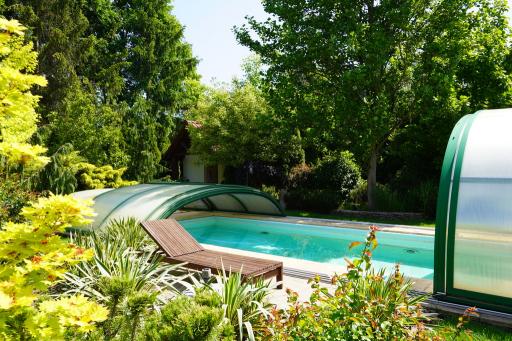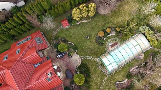 Starannie zaprojektowany i pielęgnowany ogród daje poczucie satysfakcji i upragniony odpoczynek o każdej porze roku. Oprócz rekreacji można również zażywać kąpieli w krytym, podgrzewanym basenie zarówno latem, jak i zimą. Z tarasu rozciąga się widok na ogród z liczną zielenią, a sąsiedztwie znajdują się inne domy jednorodzinne.