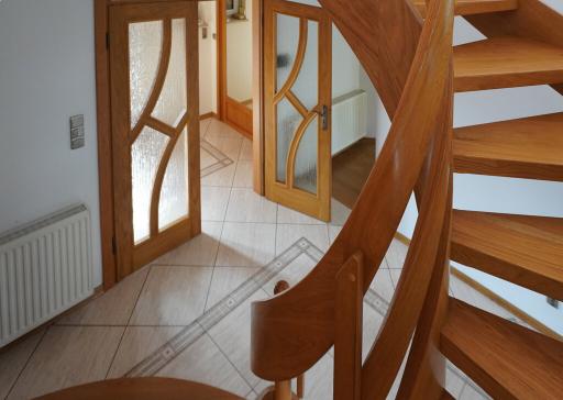Na piętro prowadzą przepiękne gięte, drewniane schody kończąc się w dużym, ponad 20 metrowym holu z balkonem, z którego odchodzą poszczególne sypialnie (45, 19, 15m2) oraz łazienki, z największej sypialni dostępna jest prywatna łazienka oraz ogromna garderoba. W bryle budynku zlokalizowany jest dwustanowiskowy garaż oraz kotłownia i pomieszczenie gospodarcze. Okna są drewniane.