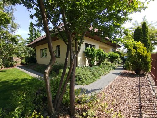 Duża działka o powierzchni 1111 m2 z zadbanym ogrodem z dużą ilością różnorodnych nasadzeń, krzewów i drzew oraz częścią wypoczynkową pokrytą trawą.