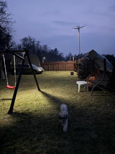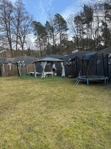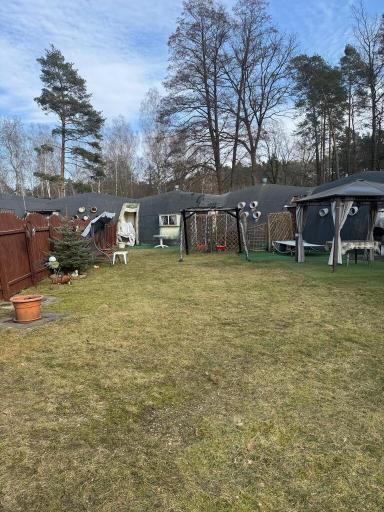 Łączna powierzchnia obu domów to 121,2 m², a w skład wchodzą: 3 pokoje, kuchnia, łazienka z WC i prysznicem. Przed domkami jest przestrzeń do odpoczynku, a wokół mnóstwo zieleni, lasów i stawów, które zapewniają prywatność i sprzyjają relaksowi. Na podwórku znajdziesz huśtawkę dla dzieci, ogrodowe meble, trampolinę, jacuzzi i leżaki – wszystko, co potrzebne do pełnego relaksu.