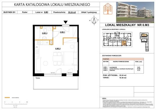 Na sprzedaż 1 pokojowy apartament o powierzchni 35,24 mkw z tarasem o powierzchni 10,30 mkw położony na parterze 3 piętrowego budynku apartamentowego.