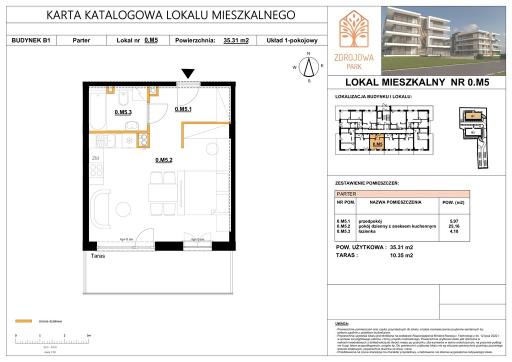 Na sprzedaż 1 pokojowy apartament o powierzchni 35,31 mkw z tarasem o powierzchni 10,35 mkw położony na parterze 3 piętrowego budynku apartamentowego.