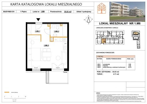Na sprzedaż 1 pokojowy apartament o powierzchni 35,03 mkw z balkonem o powierzchni 4,71 mkw położony na pierwszym piętrze 3 piętrowego budynku apartamentowego.