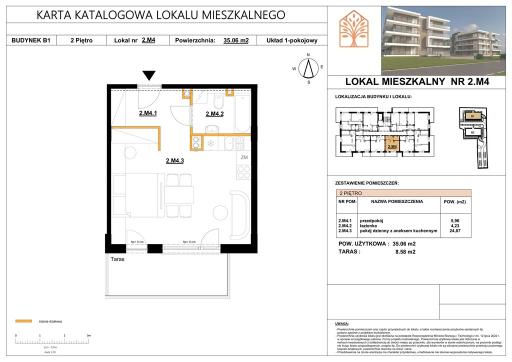 Na sprzedaż 1 pokojowy apartament o powierzchni 35,06 mkw z balkonem o powierzchni 8,58 mkw położony na drugim piętrze 3 piętrowego budynku apartamentowego.