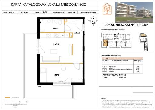 Na sprzedaż 2 pokojowy apartament o powierzchni 48,44 mkw z tarasem o powierzchni 23,49 mkw położony na drugim piętrze 3 piętrowego budynku apartamentowego.
