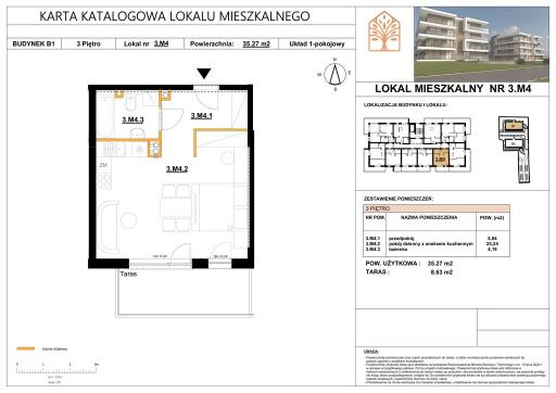 Na sprzedaż 1 pokojowy apartament o powierzchni 35,27 mkw z balkonem o powierzchni 8,63 mkw położony na trzecim piętrze 3 piętrowego budynku apartamentowego.