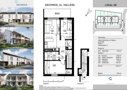 Mieszkanie 3 pokojowe składa się z wiatrołapu na parterze 3,94 m2, na piętrze korytarz 9,96 m2, salon z aneksem 19,59 m2, sypialnia 9,45 m2, łazienka 5,11 m2, garderoba z oknem 13,11 m2, balkon 9,90 m2.