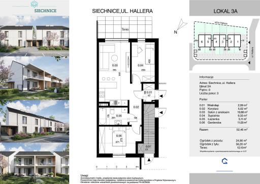Mieszkanie 3 pokojowe składa się z wiatrołapu 2,09 m2, korytarz 5,02 m2, salon z aneksem 19,88 m2, sypialnia 9,33 m2, łazienka 5,11 m2, garderoba z oknem 11,03 m2,ogród z przodu 24,60m2, ogródek z tyłu 56,2 m2, taras 12,10 m2.