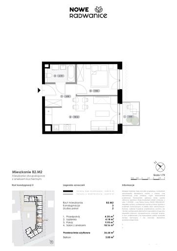 Salon z aneksem 18,16m2, pokój 9,95m2, łazienka 4,18m2, przedpokój 4,35m2.