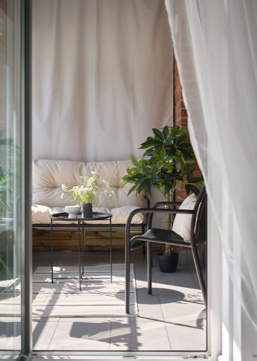 Zarówno z salonu, jak i z sypialni, można wyjść na przytulną, zadaszoną loggię, która stanowi prywatną strefę relaksu – idealną na poranną kawę czy wieczorny odpoczynek.
