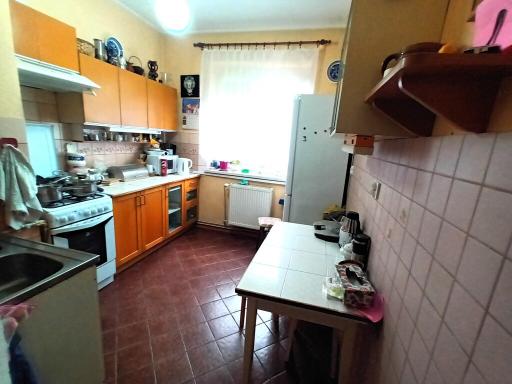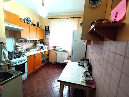 Kuchnia wyposażona jest w lodówkę, kuchenkę gazową dodatkowo na wyposażeniu są naczynia (sztućce, talerze, kubki, garnki).