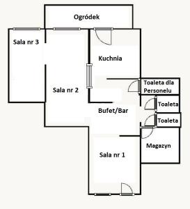 Rozkład pomieszczeń jak widać na załączonym rzucie to: 3 sale konsumpcyjne, kuchnia, 2 toalety dla klientów, toaleta dla personelu, pomieszczenie magazynowe, bufet/bar, 80 mkw ogródka oraz 25 mkw piwnicy do wyłącznego użytku.