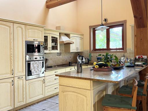 Na terenie zbudowany jest w takim samym stylu dodatkowy garaż, piwniczka umiejscowiona w skarpie na wino lub przetwory i dodatkowy budynek dla majsterkowicza.