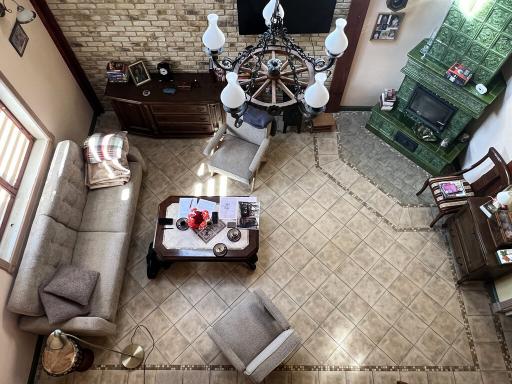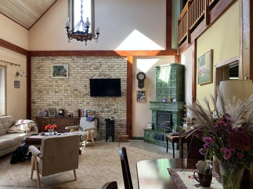 Przestronne i komfortowe pomieszczenia, przepiękna antresola wsparta na drewnianej konstrukcji, wyjątkowy kominek tworzą spójną całość oddając wyraz naturalności. To miejsce odpoczynku, spokoju i codziennego obcowania z naturą.