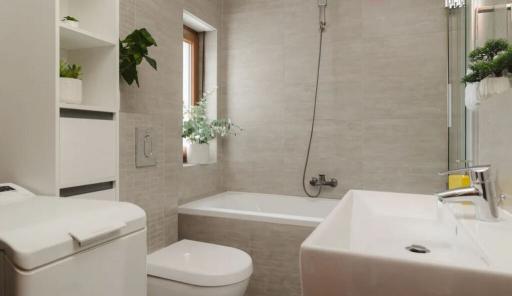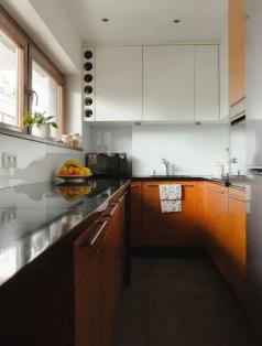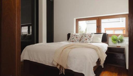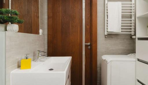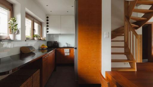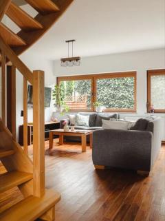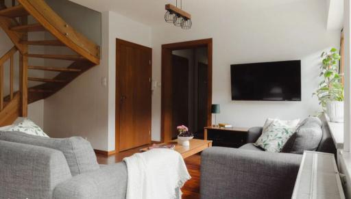 Mieszkanie znajduje się na skraju szeregowca, z dala od głównej ulicy. To nowoczesne i funkcjonalne wnętrze zaprojektowane z myślą o wygodzie codziennego życia: