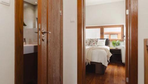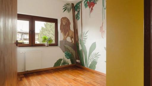 W całym mieszkaniu (poza łazienką i WC) znajduje się dębowa podłoga oraz solidne drewniane drzwi i futryny, co nadaje wnętrzu wyjątkowego charakteru.