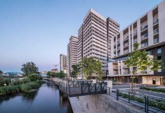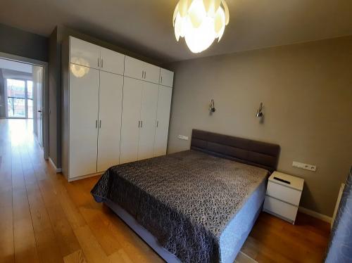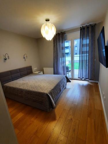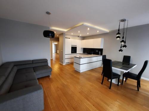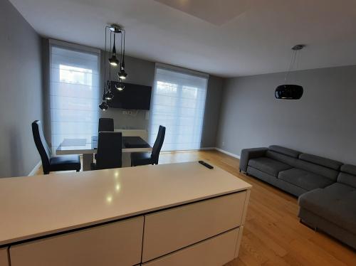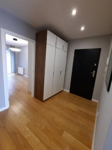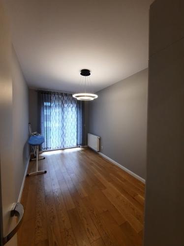 Mieszkanie jest dwustronne, składa się z przedpokoju, salonu z otwartą kuchnią połączonego z balkonem z widokiem na rzekę, sypialni z wyjściem na zielony taras o pow. 52 mkw, mniejszego pokoju oraz łazienki z kabiną prysznicową.