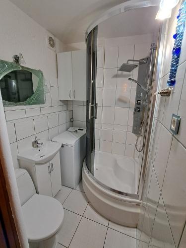 Lokal o pow. 26 mkw składa się z mini przedpokoju, dużego pokoju podzielonego na dwie strefy, otwartej kuchni oraz łazienki z kabiną prysznicową.