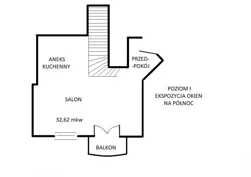 parter - północna ekspozycja okien, przedpokoik, salon z wyjściem na balkon i otwarta kuchnia ,