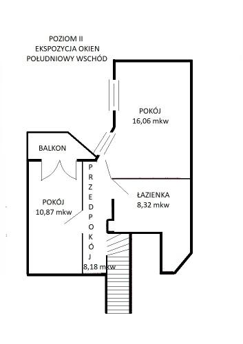 II poziom - południowo wschodnia ekspozycja okien, korytarz z szafą wnękową, duża sypialnia, pokój z wyjściem na balkon oraz przestrzenna łazienka z wanną.