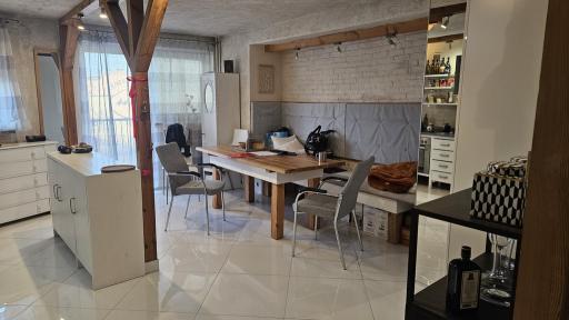 Mieszkanie położone jest na 4 i 5 piętrze budynku. Łączna powierzchnia lokalu wynosi 59,84 mkw. Na dolnym poziomie znajdują się: hol wejściowy, salon z aneksem kuchennym, balkon i mała pralnia (wcześniej wc). Na górnym poziomie znajdują się dwa przestronne pokoje i łazienka. Stan mieszkania bardzo dobry, jest ono urządzone w stylu wiejskim - w salonie zamontowano drewniane belki imitujące konstrukcję drewnianą, na ścianach wykonano tynki regionalne. Na podłogach estetyczne płytki ceramiczne.