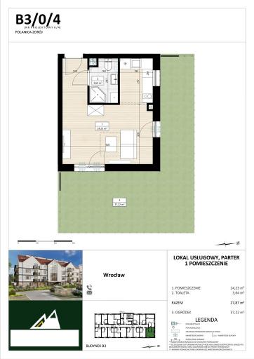Lokal inwestycyjny o powierzchni 27,87 m2, ogródek-37,22 m2. Cena za całość brutto-342801,00 zł,