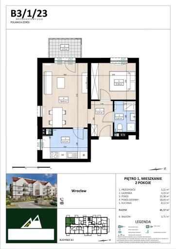 Lokal mieszkalny 2 pokojowy o powierzchni 46,37 m2, balkon-3,75 m2. Cena za całość brutto-500796,00 zł,