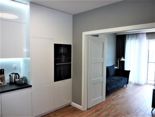 Mieszkanie składa się z przedpokoju, kuchni, łazienki z kabiną prysznicową, pokoju dziennego z wyjściem na balkon oraz pokoju sypialnianego z biurkiem (aktualnie jest 2 osobowe łózko małżeńskie). Kuchnia jest w pełni umeblowana i wyposażona (garnki, naczynia, sztućce.....) w pokojach wygodne wersalki z funkcja spania, w każdym pokoju jest pojemna szafa. Pomiędzy pokojem dziennym a kuchnią znajdują się drzwi dwuskrzydłowe dzięki którym uzyskujemy intymność lub salon z otwarta kuchnią.