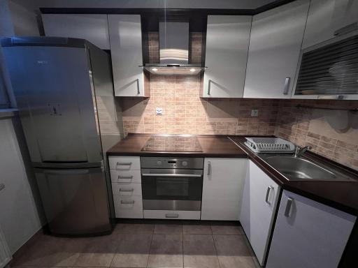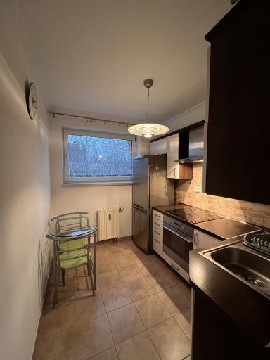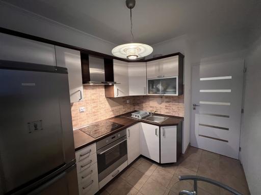 W kuchni znajdują się meble w zabudowie wraz ze sprzętami AGD.