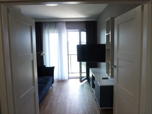 Mieszkanie składa się z przedpokoju, kuchni, łazienki z kabiną prysznicową, pokoju dziennego z wyjściem na balkon oraz pokoju sypialnianego z biurkiem (aktualnie jest 2 osobowe łózko małżeńskie). Kuchnia jest w pełni umeblowana i wyposażona (garnki, naczynia, sztućce.....) w pokojach wygodne wersalki z funkcja spania, w każdym pokoju jest pojemna szafa. Pomiędzy pokojem dziennym a kuchnią znajdują się drzwi dwuskrzydłowe dzięki którym uzyskujemy intymność lub salon z otwarta kuchnią.