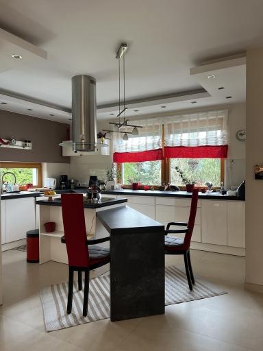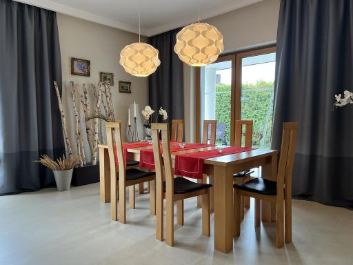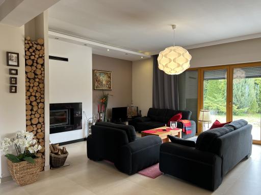 Sercem domu jest otwarta, jasna przestrzeń dzienna – salon z kominkiem, jadalnia oraz kuchnia tworzą spójną całość, sprzyjającą zarówno codziennemu życiu, jak i spotkaniom z bliskimi. Kominek dodaje wnętrzu przytulności i tworzy wyjątkowy klimat, szczególnie w chłodniejsze dni.