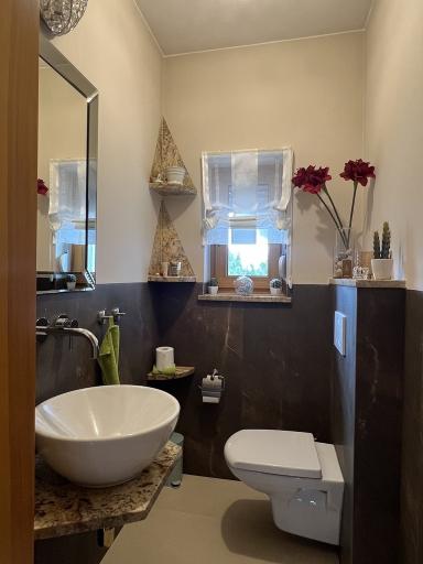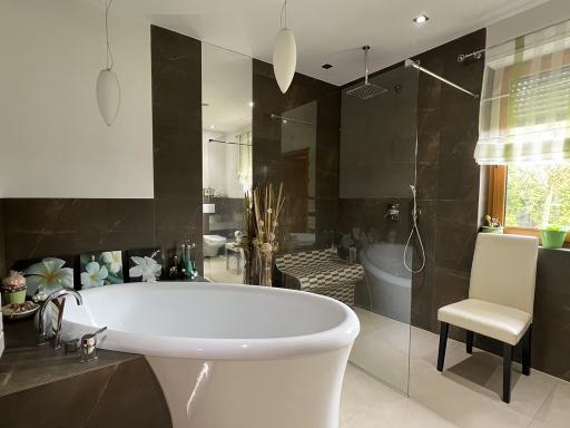 Do dyspozycji mieszkańców jest także duża, komfortowa łazienka wyposażona w wolnostojącą wannę, prysznic oraz dwie umywalki, a także dodatkowa, osobna toaleta. Uzupełnieniem funkcjonalności domu są pomieszczenie gospodarcze oraz strych.