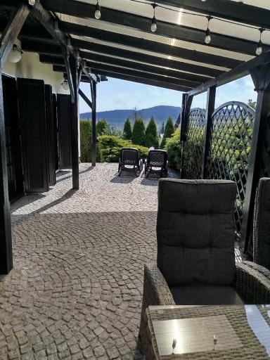 - przestronny salon z jadalnią i strefą kominkową o powierzchni 46m2 z bezpośrednim wyjściem na duży taras z pięknym widokiem.