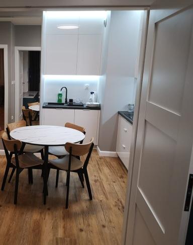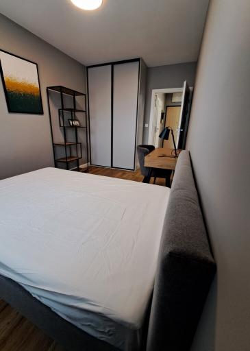 Mieszkanie składa się z przedpokoju, kuchni, łazienki z kabiną prysznicową, pokoju dziennego z wyjściem na balkon oraz pokoju sypialnianego z biurkiem (aktualnie jest 2 osobowe łózko małżeńskie). Kuchnia jest w pełni umeblowana i wyposażona (garnki, naczynia, sztućce.....) w pokojach wygodne wersalki z funkcja spania, w każdym pokoju jest pojemna szafa. Pomiędzy pokojem dziennym a kuchnią znajdują się drzwi dwuskrzydłowe dzięki którym uzyskujemy intymność lub salon z otwarta kuchnią.